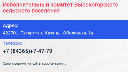 Исполнительный комитет Высокогорского сельского поселения по адресу 422701, Татарстан, Казань, Юбилейная, 1а в дальнейшем Организация, размещена в следующих категориях: