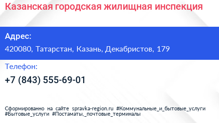 Казанская городская жилищная инспекция по адресу 420080, Татарстан, Казань, Декабристов, 179 в дальнейшем Организация, размещена в следующих категориях: