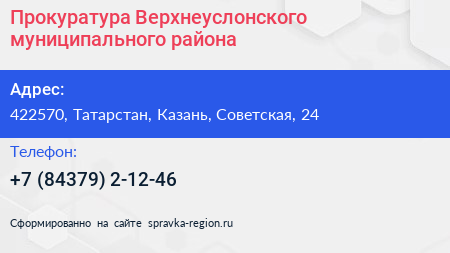 Прокуратура Верхнеуслонского муниципального района по адресу 422570, Татарстан, Казань, Советская, 24 в дальнейшем Организация, размещена в следующих категориях: