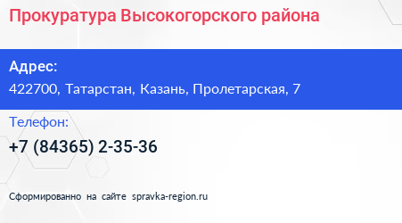 Прокуратура Высокогорского района по адресу 422700, Татарстан, Казань, Пролетарская, 7 в дальнейшем Организация, размещена в следующих категориях: