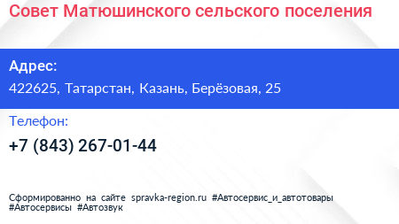 Совет Матюшинского сельского поселения по адресу 422625, Татарстан, Казань, Берёзовая, 25 в дальнейшем Организация, размещена в следующих категориях: