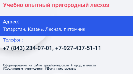 Учебно-опытный пригородный лесхоз по адресу Татарстан, Казань, Лесная, питомник в дальнейшем Организация, размещена в следующих категориях: