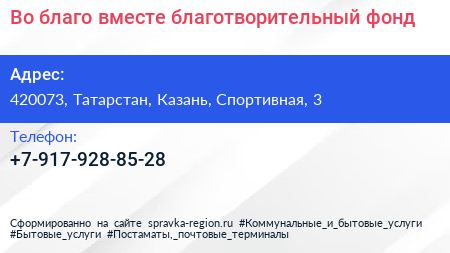 Во благо вместе, благотворительный фонд по адресу 420073, Татарстан, Казань, Спортивная, 3 в дальнейшем Организация, размещена в следующих категориях: