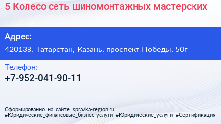5 Колесо, сеть шиномонтажных мастерских по адресу 420138, Татарстан, Казань, проспект Победы, 50г в дальнейшем Организация, размещена в следующих категориях: