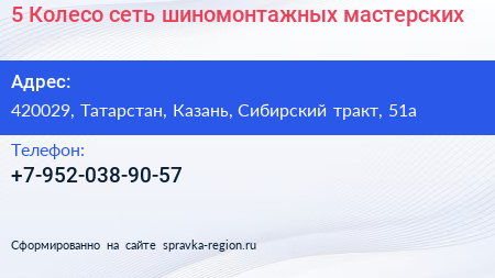 5 Колесо, сеть шиномонтажных мастерских по адресу 420029, Татарстан, Казань, Сибирский тракт, 51а в дальнейшем Организация, размещена в следующих категориях: