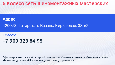5 Колесо, сеть шиномонтажных мастерских по адресу 420078, Татарстан, Казань, Бирюзовая, 38 к2 в дальнейшем Организация, размещена в следующих категориях: