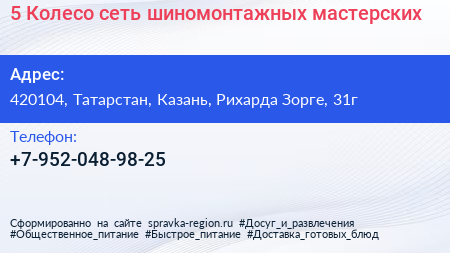 5 Колесо, сеть шиномонтажных мастерских по адресу 420104, Татарстан, Казань, Рихарда Зорге, 31г в дальнейшем Организация, размещена в следующих категориях: