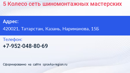 5 Колесо, сеть шиномонтажных мастерских по адресу 420021, Татарстан, Казань, Нариманова, 15Б в дальнейшем Организация, размещена в следующих категориях: