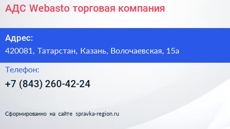 АДС-Webasto, торговая компания по адресу 420081, Татарстан, Казань, Волочаевская, 15а в дальнейшем Организация, размещена в следующих категориях: