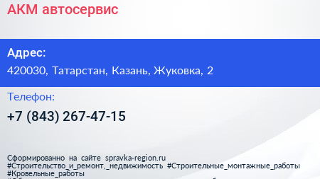 АКМ, автосервис по адресу 420030, Татарстан, Казань, Жуковка, 2 в дальнейшем Организация, размещена в следующих категориях: