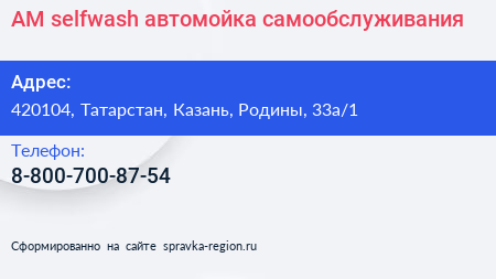 AM selfwash, автомойка самообслуживания по адресу 420104, Татарстан, Казань, Родины, 33а/1 в дальнейшем Организация, размещена в следующих категориях: