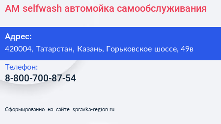 AM selfwash, автомойка самообслуживания по адресу 420004, Татарстан, Казань, Горьковское шоссе, 49в в дальнейшем Организация, размещена в следующих категориях:
