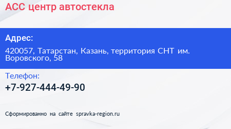 АСС, центр автостекла по адресу 420057, Татарстан, Казань, территория СНТ им. Воровского, 58 в дальнейшем Организация, размещена в следующих категориях: