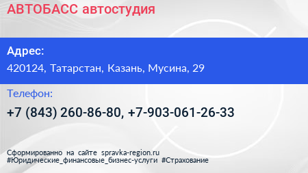 АВТОБАСС, автостудия по адресу 420124, Татарстан, Казань, Мусина, 29 в дальнейшем Организация, размещена в следующих категориях: