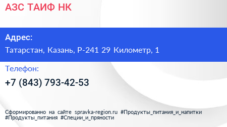 АЗС, ТАИФ-НК по адресу Татарстан, Казань, Р-241 29 Километр, 1 в дальнейшем Организация, размещена в следующих категориях: