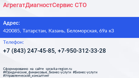 АгрегатДиагностСервис, СТО по адресу 420085, Татарстан, Казань, Беломорская, 69а к3 в дальнейшем Организация, размещена в следующих категориях: