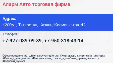 Аларм Авто, торговая фирма по адресу 420061, Татарстан, Казань, Космонавтов, 44 в дальнейшем Организация, размещена в следующих категориях: