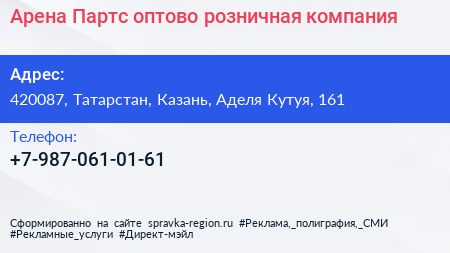 Арена Партс, оптово-розничная компания по адресу 420087, Татарстан, Казань, Аделя Кутуя, 161 в дальнейшем Организация, размещена в следующих категориях: