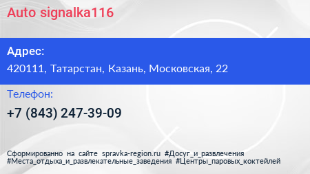 Auto-signalka116 по адресу 420111, Татарстан, Казань, Московская, 22 в дальнейшем Организация, размещена в следующих категориях: