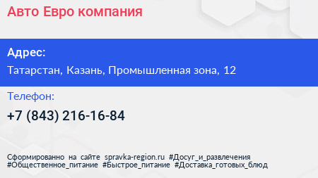 Авто-Евро, компания по адресу Татарстан, Казань, Промышленная зона, 12 в дальнейшем Организация, размещена в следующих категориях: