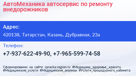 АвтоМеханика, автосервис по ремонту внедорожников по адресу 420138, Татарстан, Казань, Дубравная, 23а в дальнейшем Организация, размещена в следующих категориях: