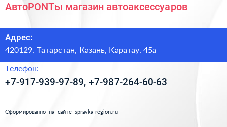 АвтоPONTы, магазин автоаксессуаров по адресу 420129, Татарстан, Казань, Каратау, 45а в дальнейшем Организация, размещена в следующих категориях: