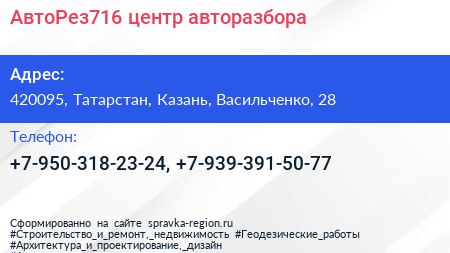 АвтоРез716, центр авторазбора по адресу 420095, Татарстан, Казань, Васильченко, 28 в дальнейшем Организация, размещена в следующих категориях: