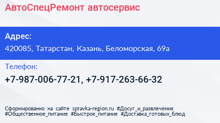 АвтоСпецРемонт, автосервис по адресу 420085, Татарстан, Казань, Беломорская, 69а в дальнейшем Организация, размещена в следующих категориях: