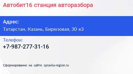 Автобит16, станция авторазбора по адресу Татарстан, Казань, Бирюзовая, 30 к3 в дальнейшем Организация, размещена в следующих категориях: