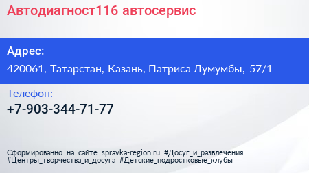 Автодиагност116, автосервис по адресу 420061, Татарстан, Казань, Патриса Лумумбы, 57/1 в дальнейшем Организация, размещена в следующих категориях: