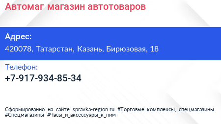 Автомаг, магазин автотоваров по адресу 420078, Татарстан, Казань, Бирюзовая, 18 в дальнейшем Организация, размещена в следующих категориях: