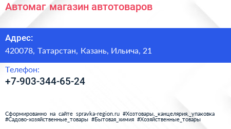 Автомаг, магазин автотоваров по адресу 420078, Татарстан, Казань, Ильича, 21 в дальнейшем Организация, размещена в следующих категориях: