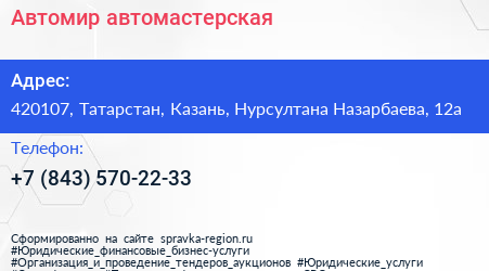 Автомир, автомастерская по адресу 420107, Татарстан, Казань, Нурсултана Назарбаева, 12а в дальнейшем Организация, размещена в следующих категориях: