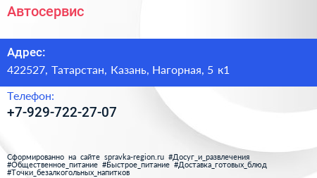 Автосервис по адресу 422527, Татарстан, Казань, Нагорная, 5 к1 в дальнейшем Организация, размещена в следующих категориях: