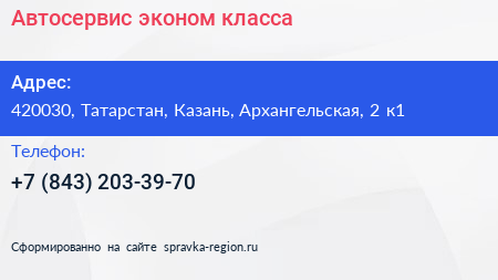 Автосервис эконом-класса по адресу 420030, Татарстан, Казань, Архангельская, 2 к1 в дальнейшем Организация, размещена в следующих категориях: