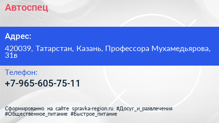 Автоспец по адресу 420039, Татарстан, Казань, Профессора Мухамедьярова, 31в в дальнейшем Организация, размещена в следующих категориях: