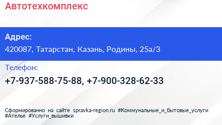 Автотехкомплекс по адресу 420087, Татарстан, Казань, Родины, 25а/3 в дальнейшем Организация, размещена в следующих категориях: