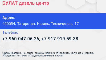 БУЛАТ, дизель-центр по адресу 420054, Татарстан, Казань, Техническая, 17 в дальнейшем Организация, размещена в следующих категориях: