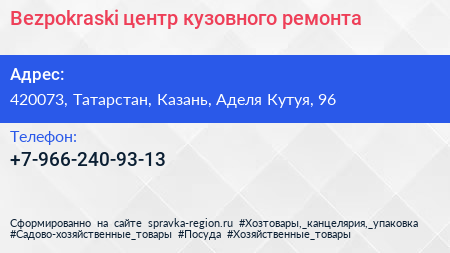Bezpokraski, центр кузовного ремонта по адресу 420073, Татарстан, Казань, Аделя Кутуя, 96 в дальнейшем Организация, размещена в следующих категориях: