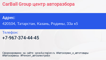 CarBall Group, центр авторазбора по адресу 420104, Татарстан, Казань, Родины, 33а к5 в дальнейшем Организация, размещена в следующих категориях: