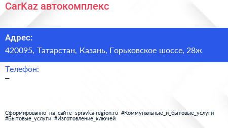 CarKaz, автокомплекс по адресу 420095, Татарстан, Казань, Горьковское шоссе, 28ж в дальнейшем Организация, размещена в следующих категориях: