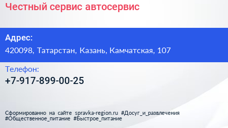Честный сервис, автосервис по адресу 420098, Татарстан, Казань, Камчатская, 107 в дальнейшем Организация, размещена в следующих категориях: