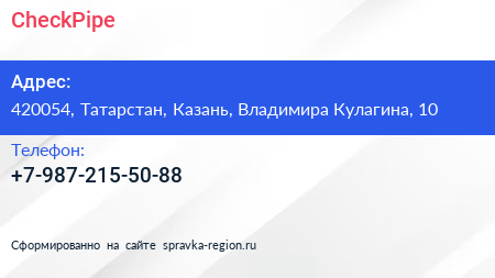 CheckPipe по адресу 420054, Татарстан, Казань, Владимира Кулагина, 10 в дальнейшем Организация, размещена в следующих категориях:
