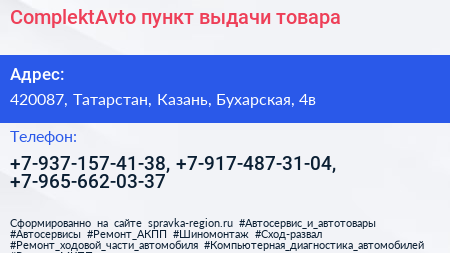 ComplektAvto, пункт выдачи товара по адресу 420087, Татарстан, Казань, Бухарская, 4в в дальнейшем Организация, размещена в следующих категориях: