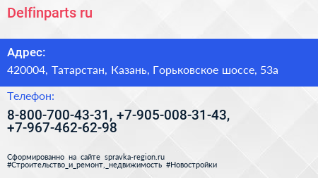 Delfinparts.ru по адресу 420004, Татарстан, Казань, Горьковское шоссе, 53а в дальнейшем Организация, размещена в следующих категориях: