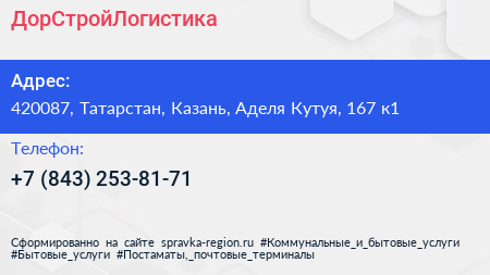 ДорСтройЛогистика по адресу 420087, Татарстан, Казань, Аделя Кутуя, 167 к1 в дальнейшем Организация, размещена в следующих категориях: