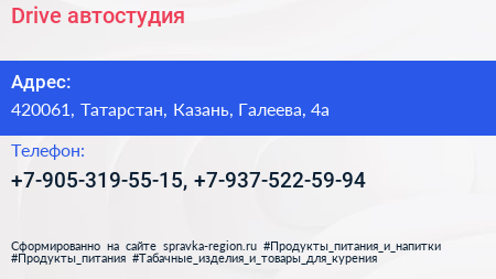 Drive, автостудия по адресу 420061, Татарстан, Казань, Галеева, 4а в дальнейшем Организация, размещена в следующих категориях: