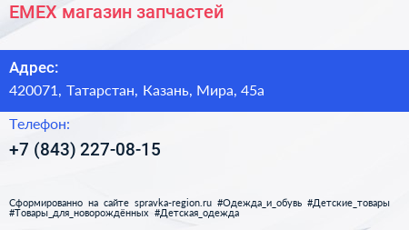 EMEX, магазин запчастей по адресу 420071, Татарстан, Казань, Мира, 45а в дальнейшем Организация, размещена в следующих категориях: