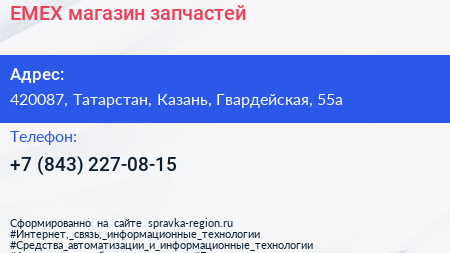 EMEX, магазин запчастей по адресу 420087, Татарстан, Казань, Гвардейская, 55а в дальнейшем Организация, размещена в следующих категориях:
