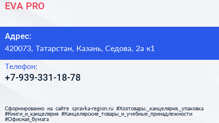EVA PRO по адресу 420073, Татарстан, Казань, Седова, 2а к1 в дальнейшем Организация, размещена в следующих категориях: